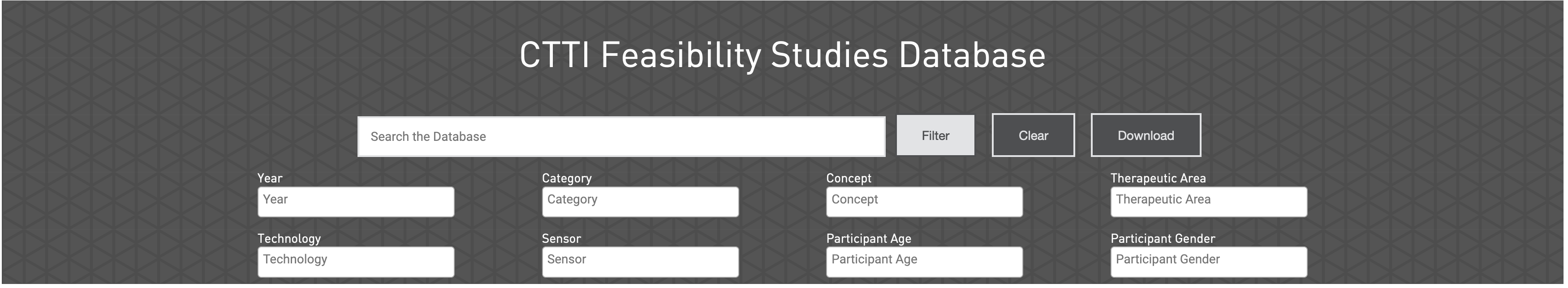 CTTI’s interactive database was developed as a tool to identify, collect, and organize feasibility studies using mobile technologies to capture data in clinical research, intended to serve as a dynamic, up to date repository. With this database, CTTI intends to help alleviate future development of redundant studies and contribute to the design and implementation of high quality, efficient trials.